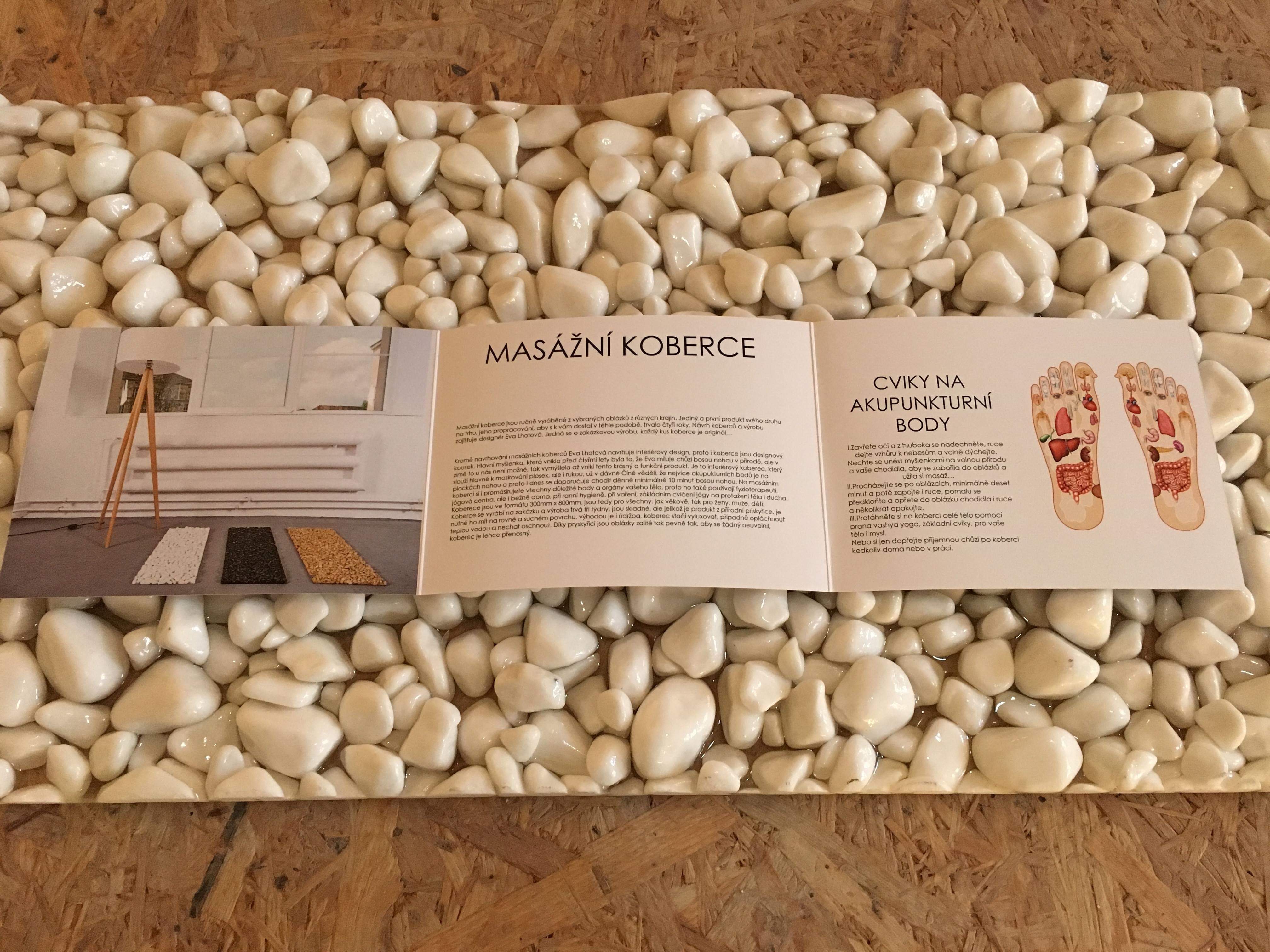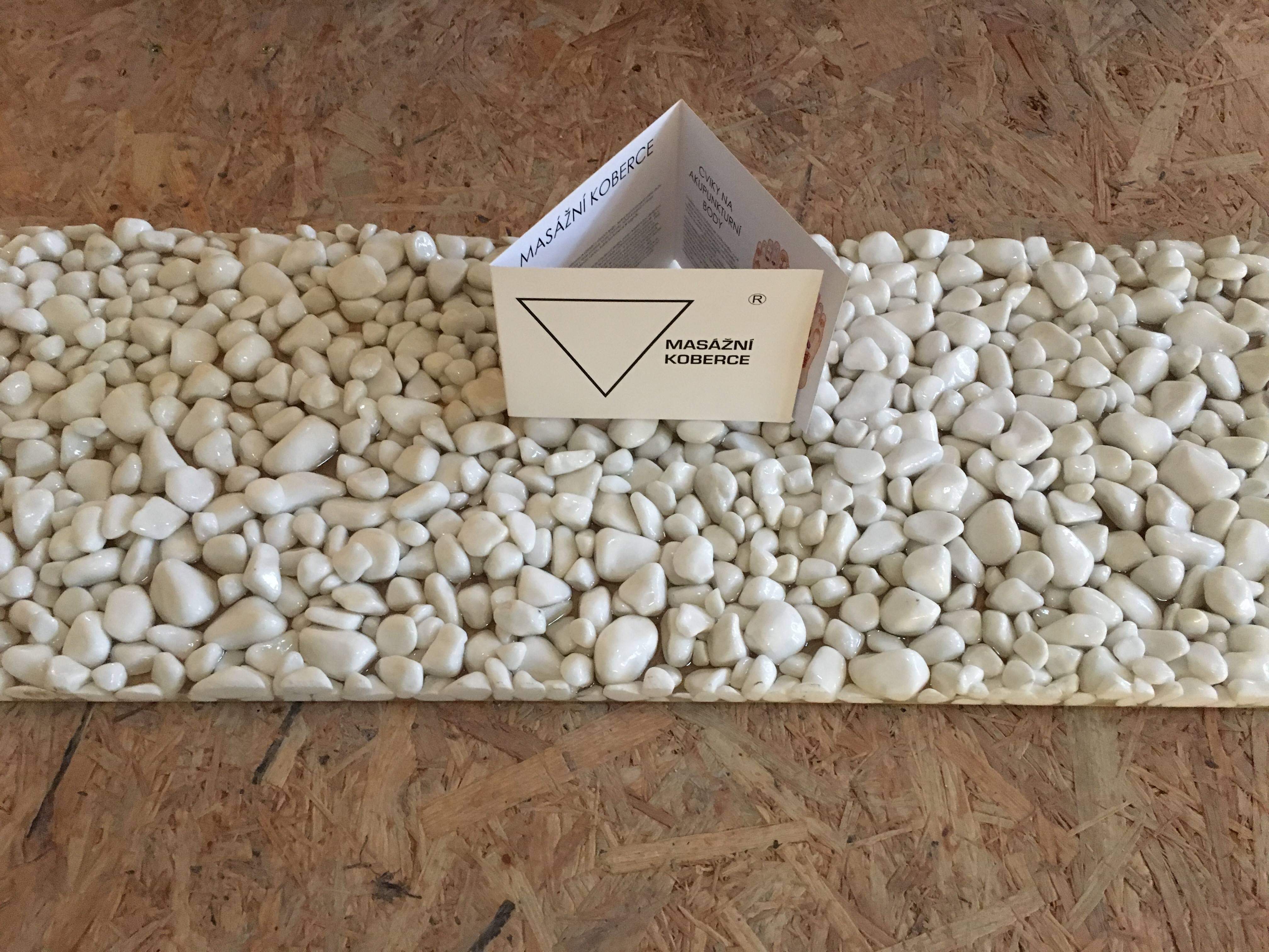 Masážní koberce jsou ručně vyráběné z vybraných oblázků z různých krajin. Jediný a první produkt svého druhu na trhu, jeho propracování, aby s k vám dostal v téhle podobě, trvalo čtyři roky. Jedná se o zakázkovou výrobu, každý kus koberce je originál a designový kousek. Hlavní myšlenka, která vnikla před čtyřmi lety byla ta, že miluji chůzi bosou nohou v přírodě, ale v zimě to u nás není možné, tak jsem vymýšlela až vnikl tento krásný a funkční produkt. Jedná se o interiérový koberec, který slouží hlavně k masírování chodidel, ale i rukou, není vhodný do exteriéru a mokrého prostředí, možnost uklouznutí. Něco málo z historie, už v dávné Číně věděli, že nejvíce akupukturních bodů je na plockách nohou a proto se i dnes doporučuje chodit děnně minimálně 10 minut bosou nohou. Na masážním koberci si i promasírujete všechny důležité body a orgány vašeho těla, proto ho také používají fyzioterapeuti, jógová centra, ale i bežně doma, při ranní hygieně, při vaření, zákládním cvičení jógy na protažení těla i ducha. Koberece jsou ve formátu 300mm x 850mm, jen barva Black je 300mm x 800 mm ( jelikož se jedná o ruční výrobu může být menší odchylka v rozměru, v toleranci je 30mm), jsou tedy pro všechny, jak věkově, tak pro ženy, muže, děti. Koberce se vyrábí na zakázku, termín výroby je tři až šest týdnů, koberce jsou skladné, ale jelikož je produkt z přírodní pryskyřice, je nutné ho mít na rovném a suchém povrchu. Výhodou je údržba, koberec stačí vyluxovat, případně opláchnout teplou vodou a nechat oschnout. Díky pryskyřici jsou oblázky zalité tak pevně tak, aby se žádný neuvolnil, koberec je lehce přenosný. Ke koberci dostanete protiskluzovou podložku. Pár kusů máme vyrobeno do zásoby a jsou k dispozici už nyní. Masážní koberce jsou ve pěti barevných provedeních, White, Black, Camel, Grey+White, Red (barvy White, Black a Camel jsou momentálně vyprodané), nejjemější jsou bílé oblázky, ostátním soukromě říkáme ostré ranní probuzení. Cena za kus je 5 500 Kč + 270 Kč doprava. Více informací a objednávky přes kontaktní formulář a nebo e-mail [email protected]